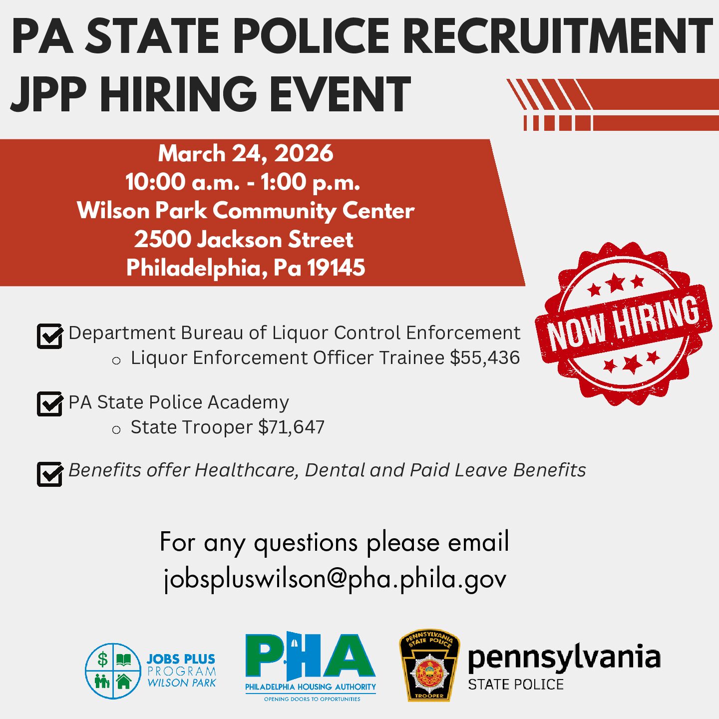 March 24, 2026 @ 10:00 am - 1:00 pm EDT PA State Police Recruitment JPP Hiring Event Wilson Park Community Center 2500 Jackson Street, Philadelphia, PA, United States